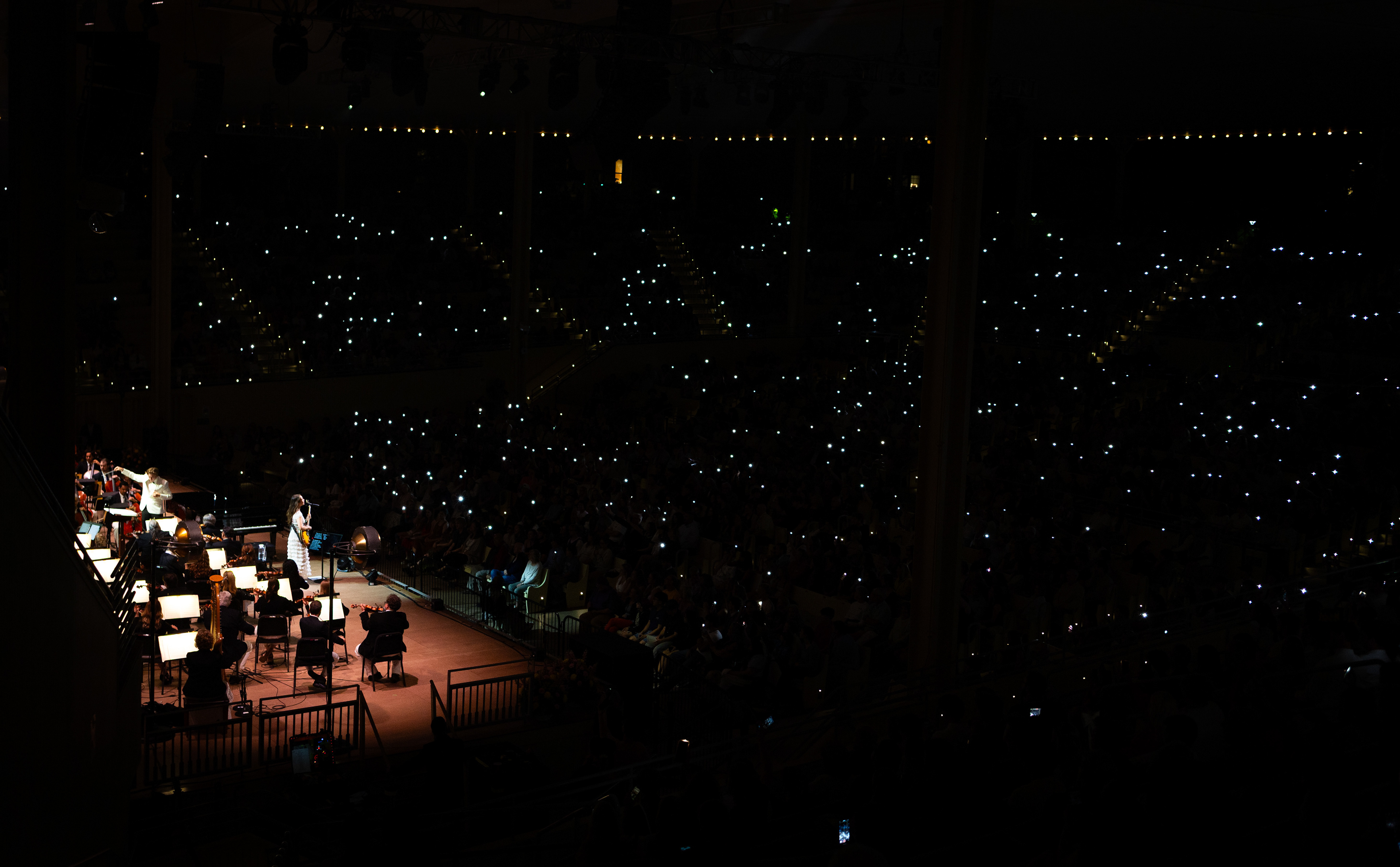 A sold-out crowd use the lights on their cellphones to illuminate the audience while Grammy Award winning singer-songwriter, Laufey, performs with the Chautauqua Symphony Orchestra under the baton of guest conductor Ross Jamie Collins on Sunday, August 3, 2025 in the Amphitheater.