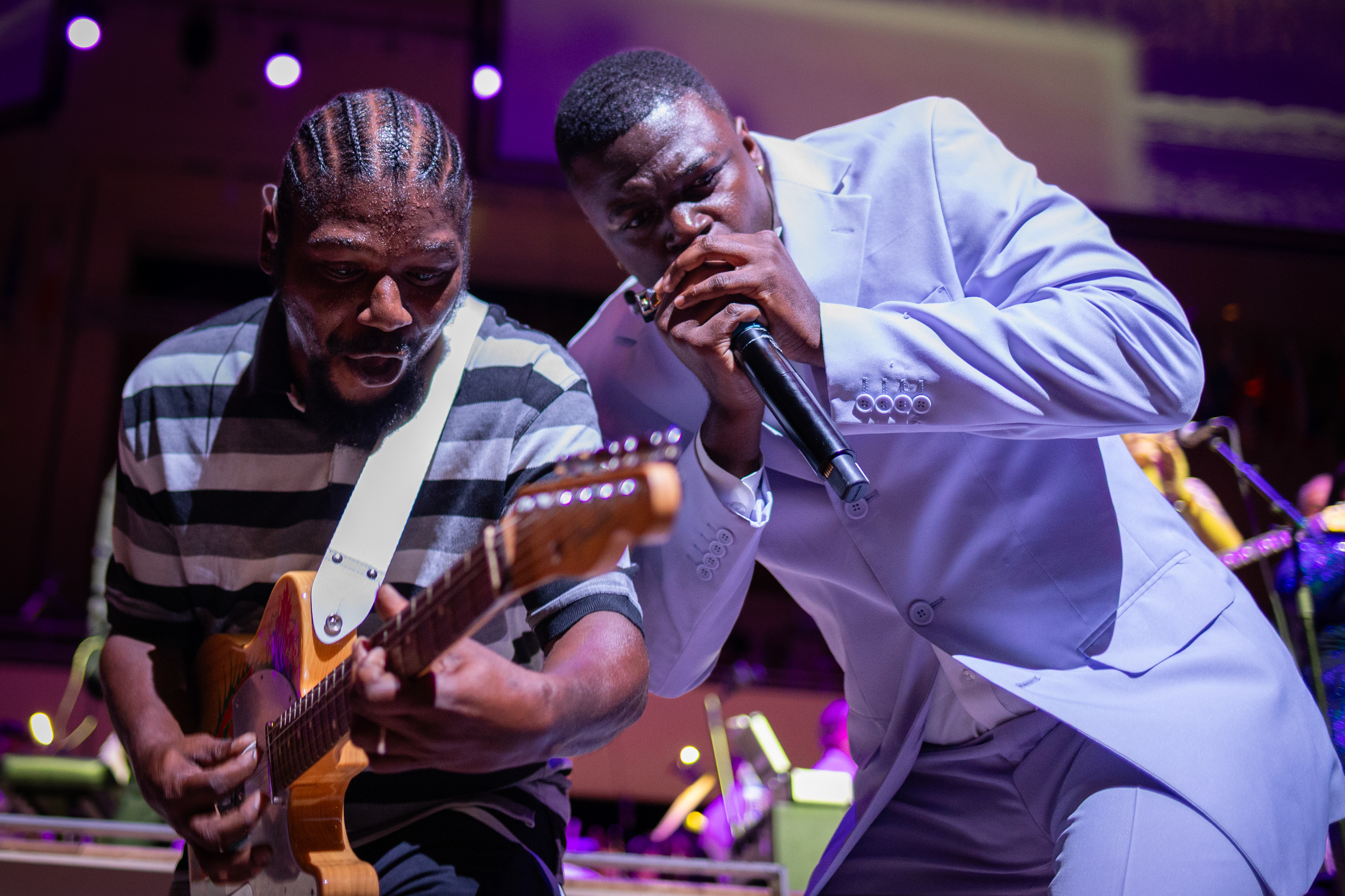 Blues musicians Anthony “Big A” Sherrod, left, and Keith Johnson take their performance off the stage and into the crowd during the encore of Morgan Freeman’s Symphonic Blues Experience with the Chautauqua Symphony Orchestra on Tuesday, August 19, 2025 in the Amphitheater at Chautauqua Institution.