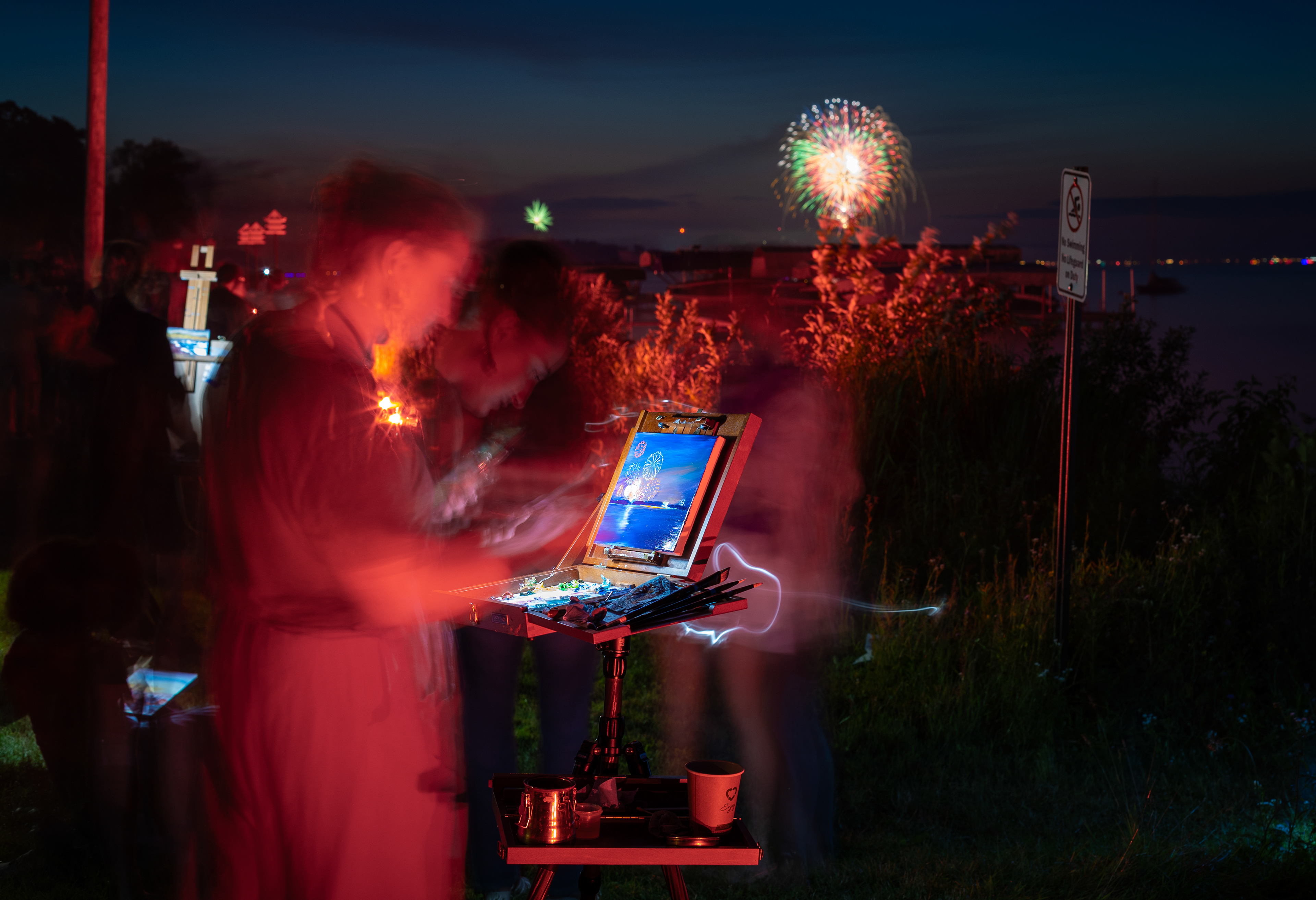 Painter and Chautauqua Visual Arts resident, Julia Gould, works on a live oil painting of fireworks on Friday July 4, 2025 on Chautauqua Lake.