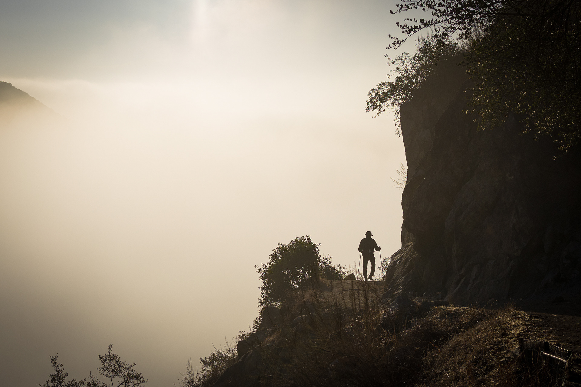 A hiker makes his descent down Mount Wilson in the San Gabriel Mountians during a foggy morning on Monday, December 30, 2024 in Sierra Madre, California.