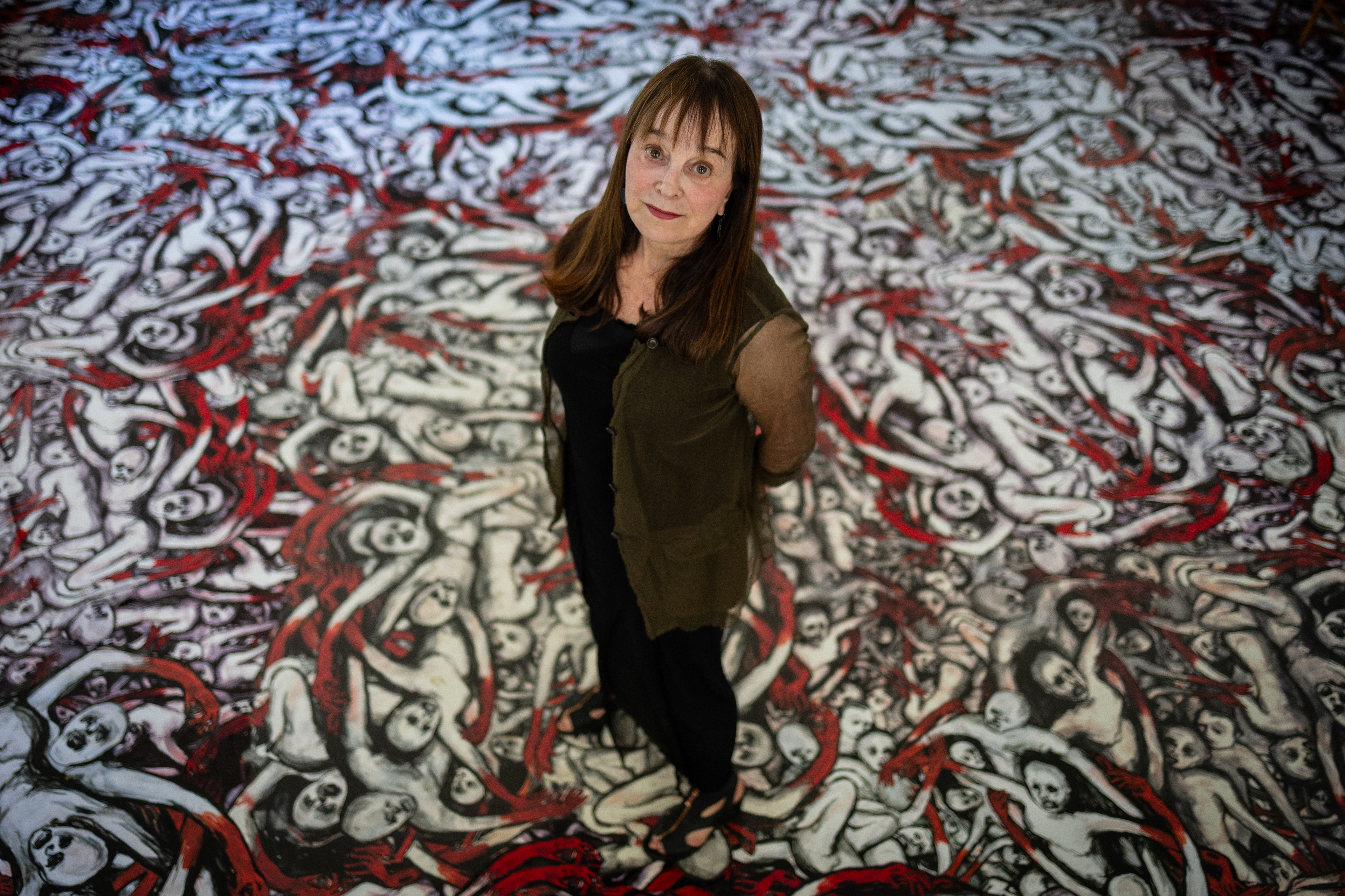 Fine artist and printmaker Rosemary Feit Covey stands with her piece Red Handed – Sudan: Don't Turn Away made from acrylic paint on vinyl and installed on the floor of Randall Chapel on Wednesday July 23, 2025 at Chautauqua Institution. This installation focuses specifically on the two-year civil war in Sudan that has left tens of thousands dead and millions displaced.