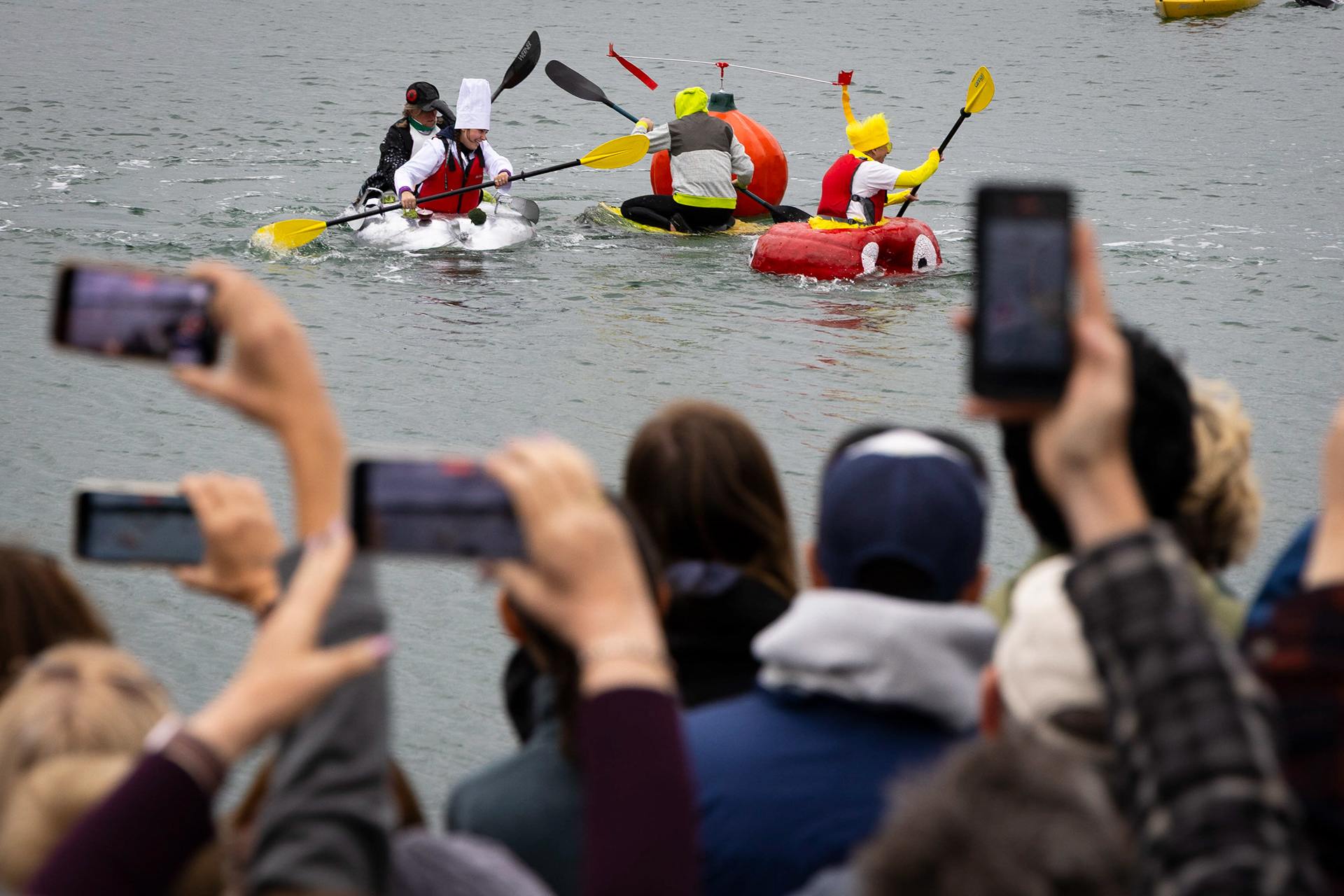 Thousands of spectators gather on the banks of the Damariscotta river during the annual Damariscotta pumpkin festival and regatta to watch the racers compete on Sunday, October 12, 2025 in Damariscotta, Maine. Participants spend two to three days hallowing out their pumpkins – which weigh upwards of 600 pounds – before they are delivered to the water by forklift.