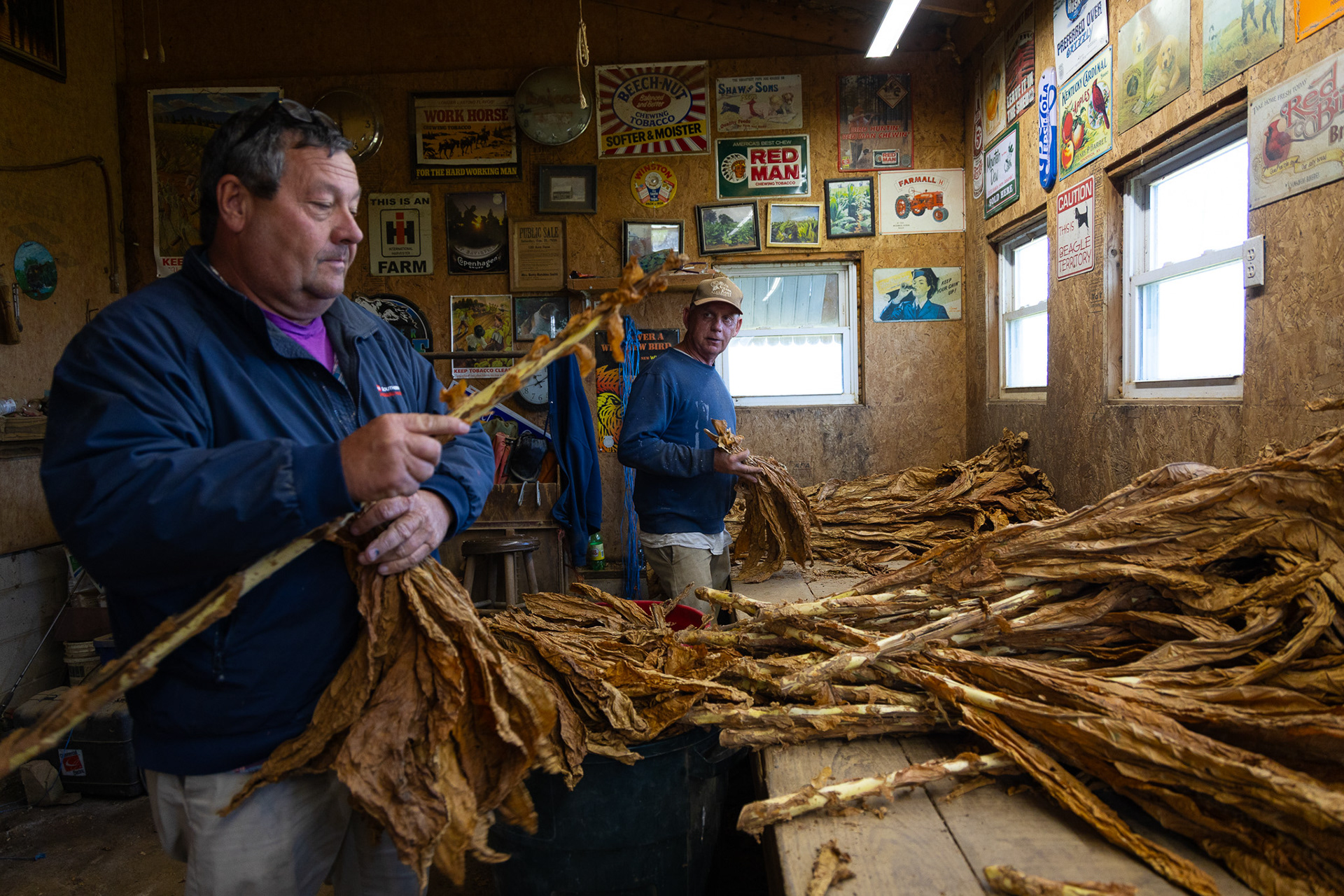In a barn on his family’s farm, tobacco farmer Mike Miller (right) and Jason strip dried tobacco leaves from their stalks before sorting them in preparation for baling and packing for shipping.