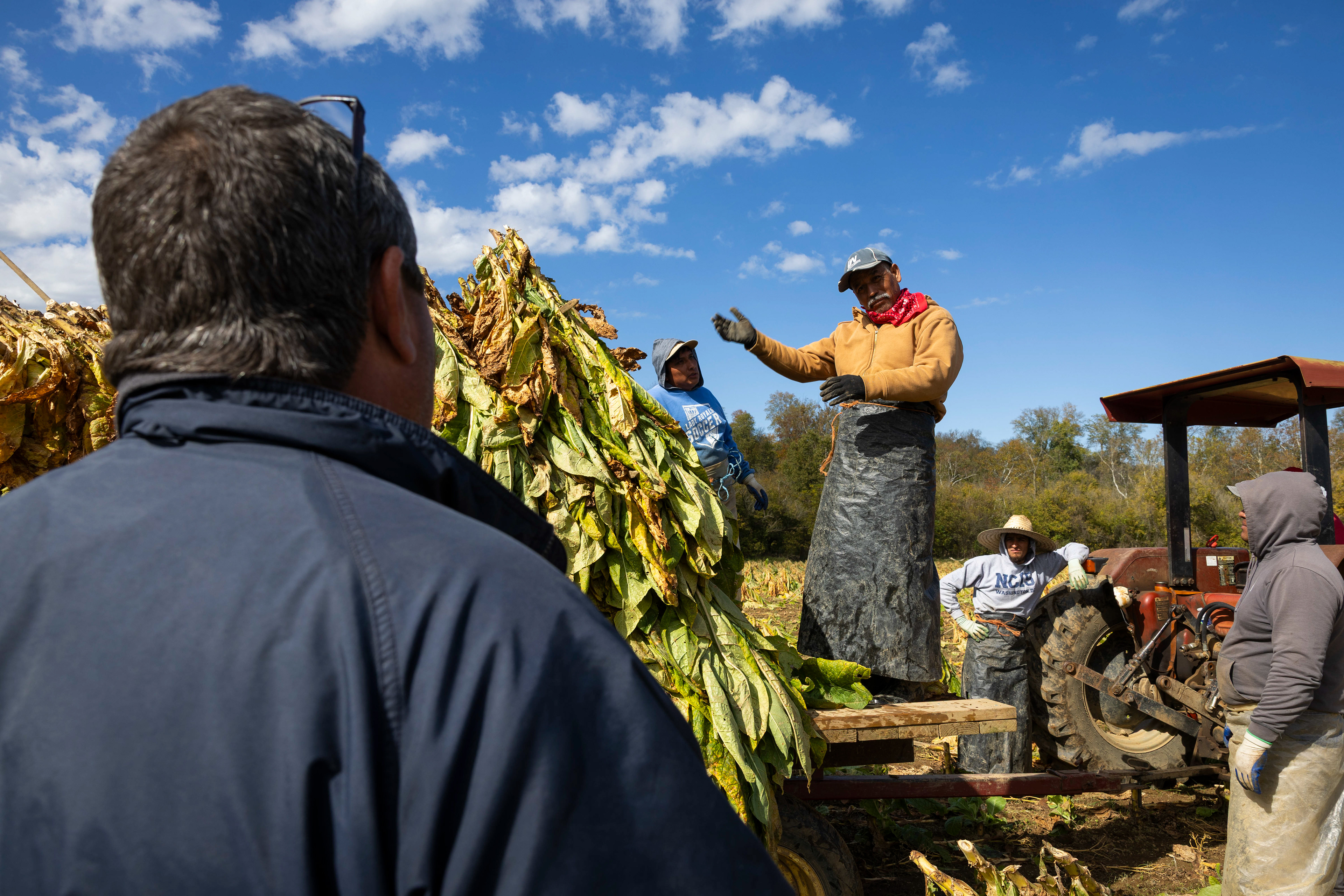 Jason (right) and one of his workers, Justino Hernandez, discuss plans for moving a trailer of tobacco to a barn for drying.