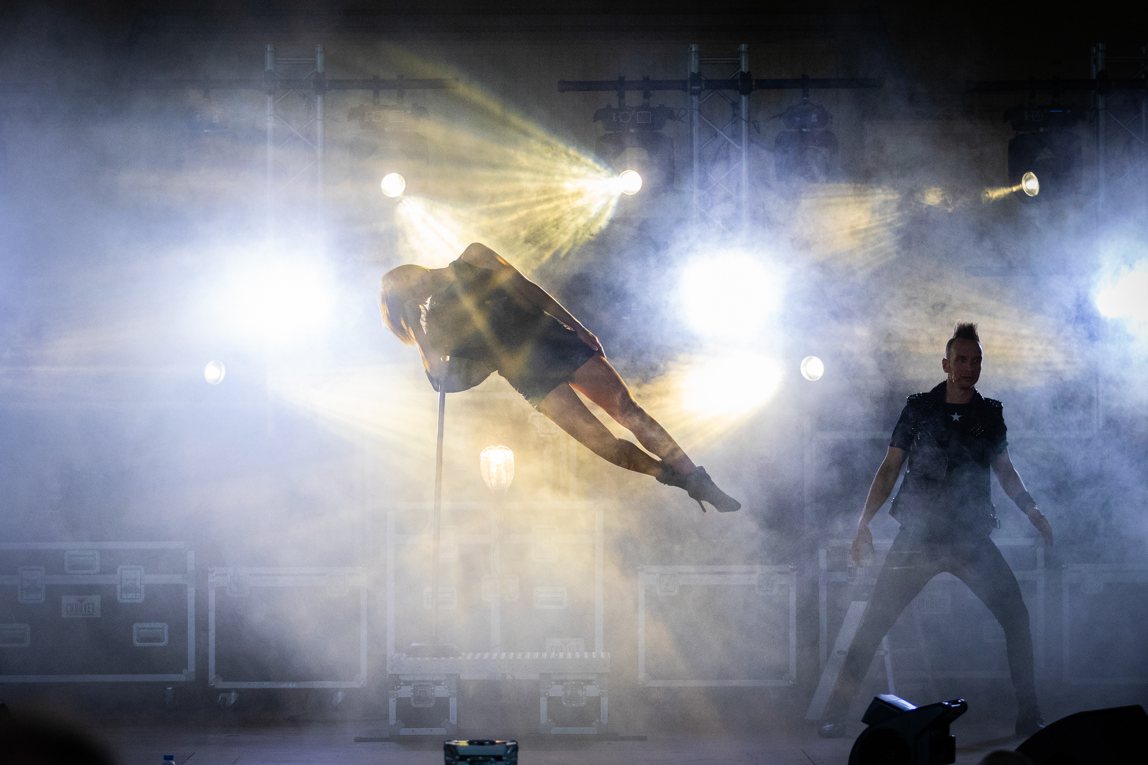 Magicians assistant Chelsea LaCongo, left, hovers in the air while Leone Etienne performs an illusion during their Magic Rocks performance on Sunday, July 6, 2025 in Chautauqua, New York.