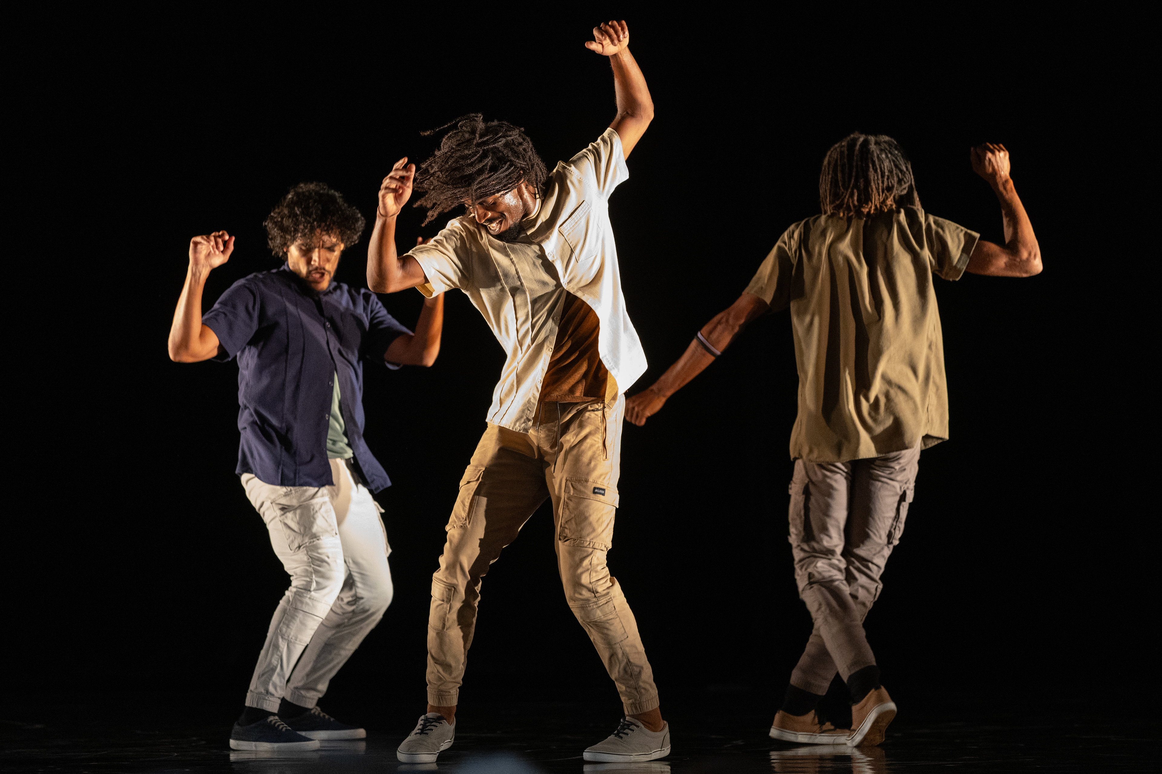 Esteban Aguilar, left, Esven Conrado Gonzáles Morales, middle, and Onsel Delgado of the Malpaso Dance Company perform the piece Floor… y Ando choreographed by Ephrat Asherie on Wednesday, July 9, 2025 in the Chautauqua, New York.