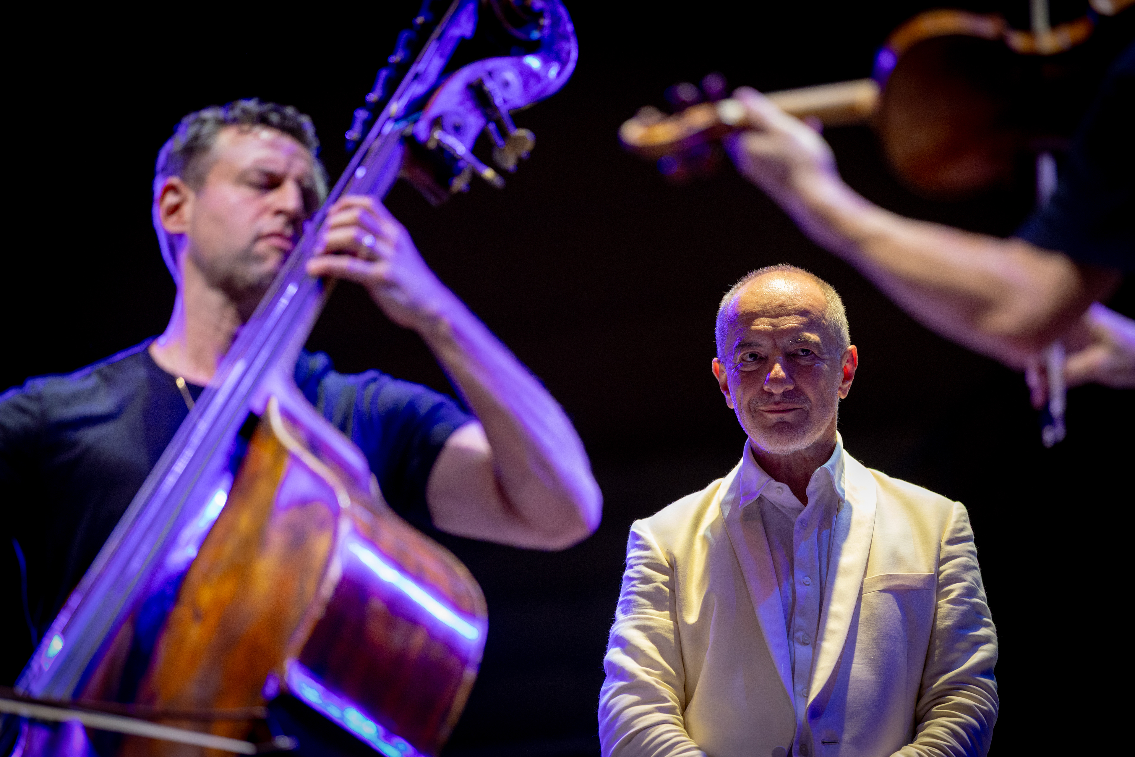 Music Director and Principle Symphonic Director, Rossen Milanov admires the Chamber Ensemble Time For Three while they execute a solo during their performance with the Chautauqua Symphony Orchestra on Saturday, July 26, 2025 in Chautauqua, New York.