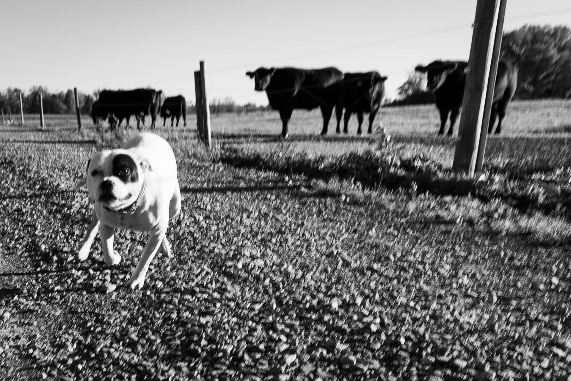 Peach, a French Bulldog is frightened be a herd of curious cows after encountering the animals for the first time in her life on Thursday, October 16, 2025 on Tilden Hill Farm in Vernon, New York.