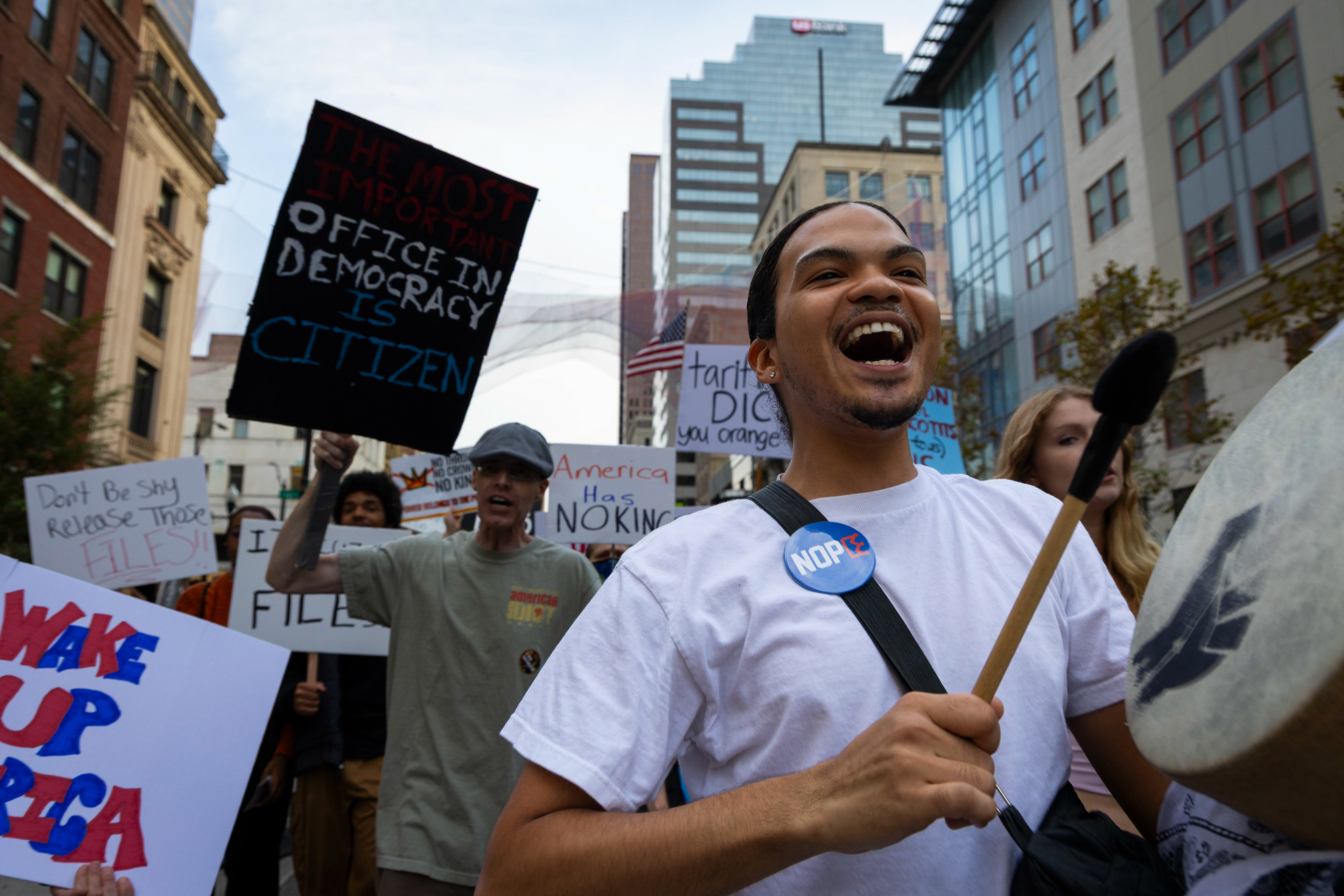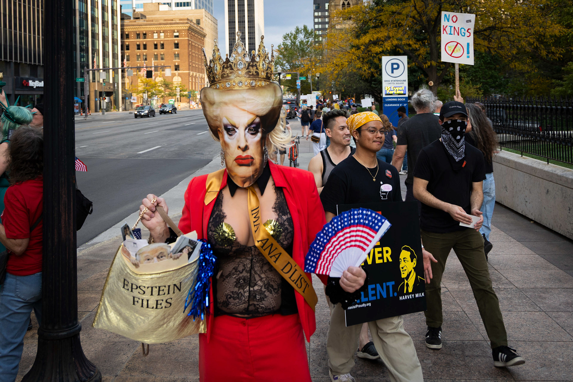 Parade-goers march down High Street near the end of the annual Columbus Pride Parade on Saturday, June 14, 2025 in Columbus, Ohio.
