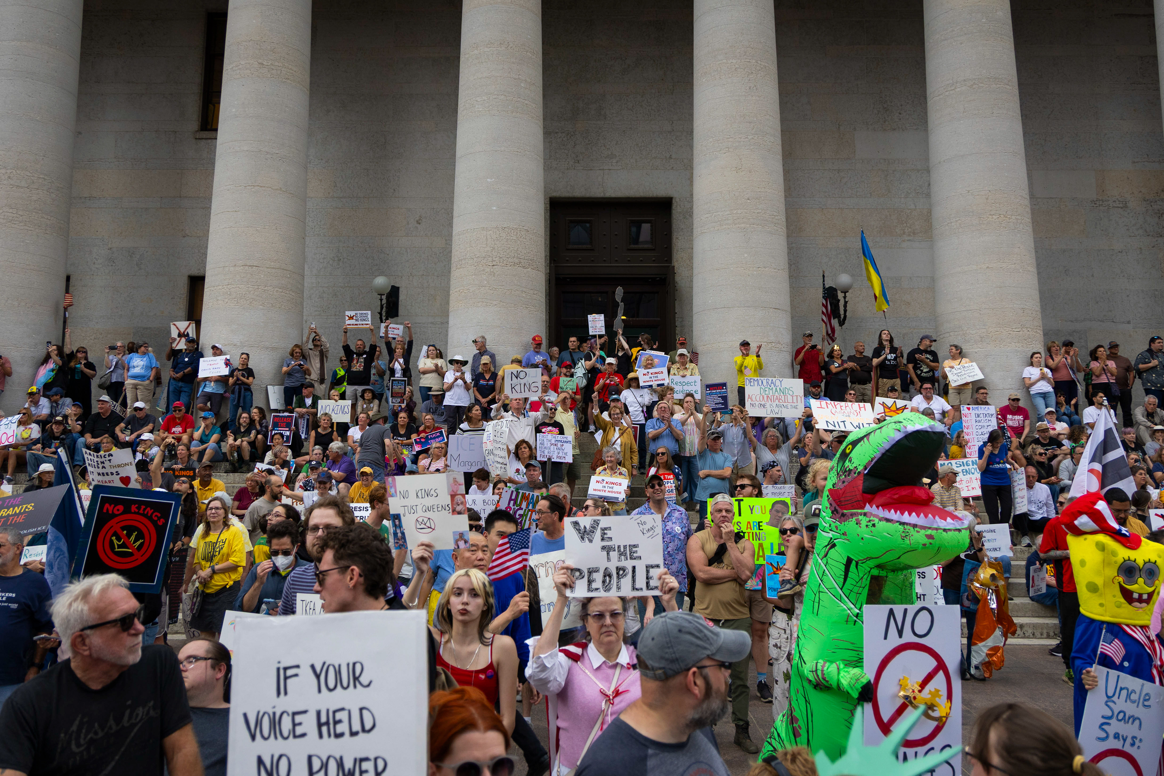 Officers of the Columbus Police Department observe the crowds as they progress down High Street on Saturday, June 14, 2025 in Columbus, Ohio.
