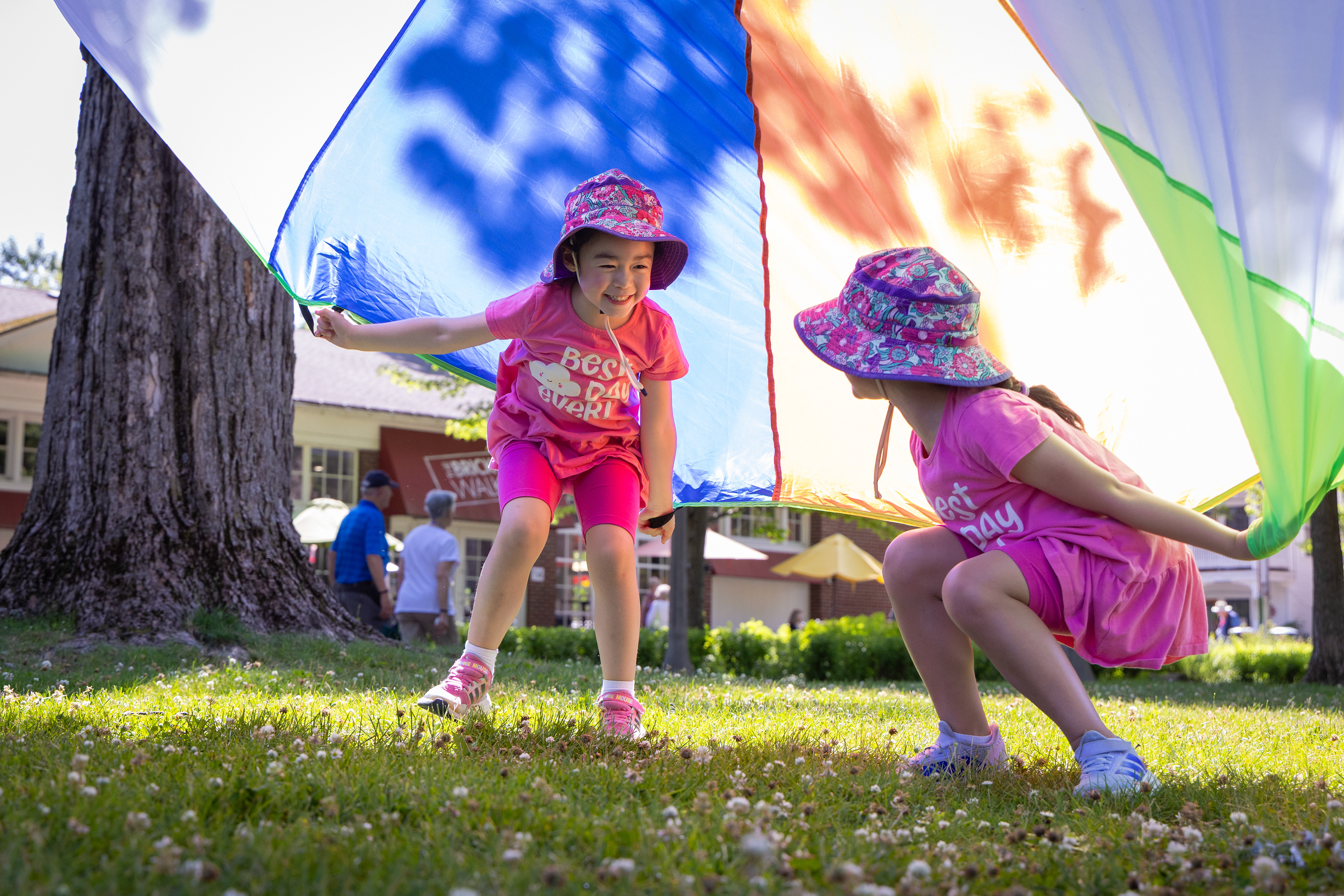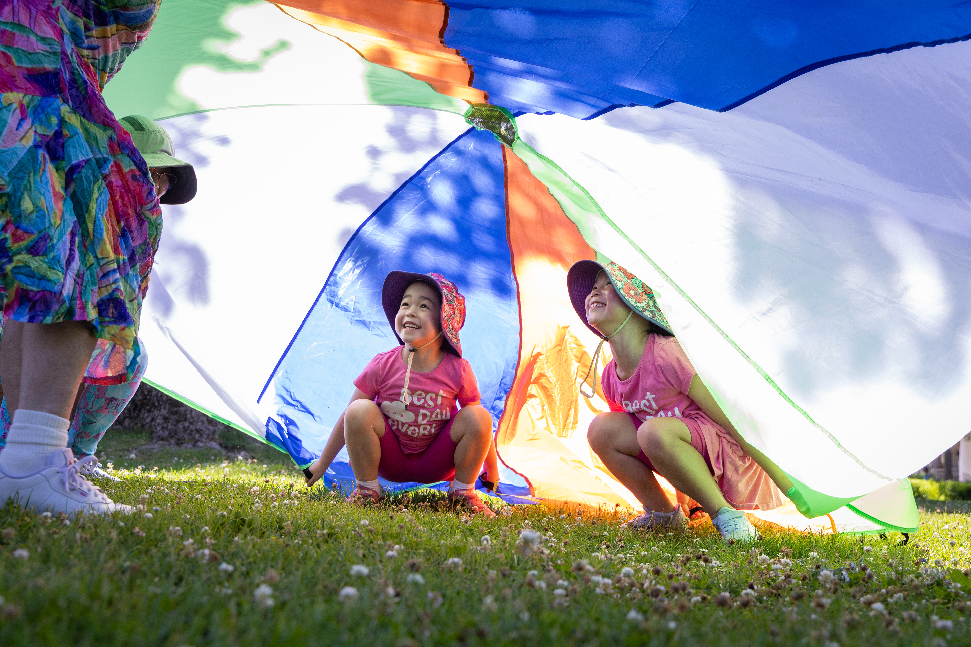 Selene Rizzolo, left, and Isabelle Rizzolo share a moment of joy while playing under a parachute with their family on Tuesday, June 24, 2025 in Chautauqua, New York.