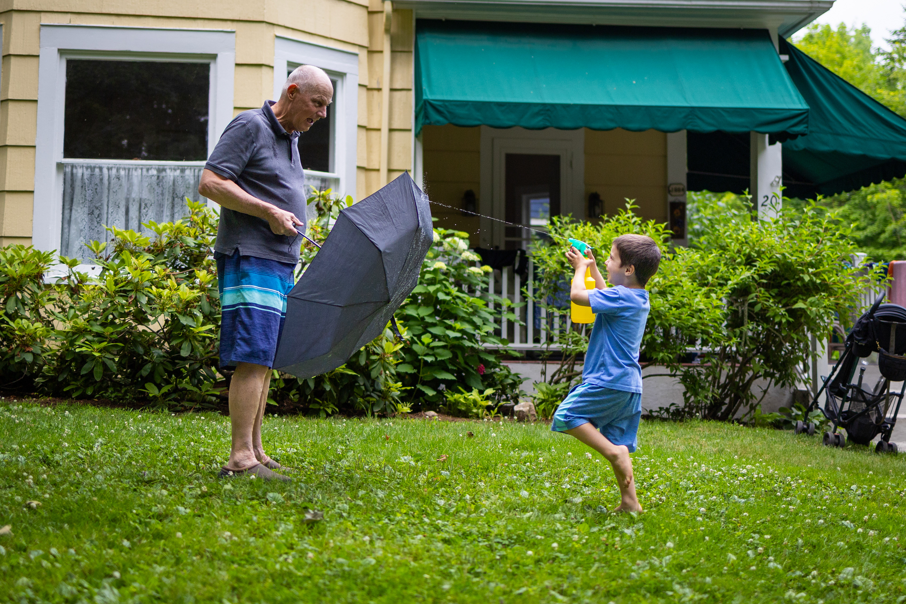 John Roberts, left, shields himself with an umbrella while Rory DeLigter attempts to spray him with water in the front yard of their summer home on Monday, July 7, 2025 in Chautauqua, New York.