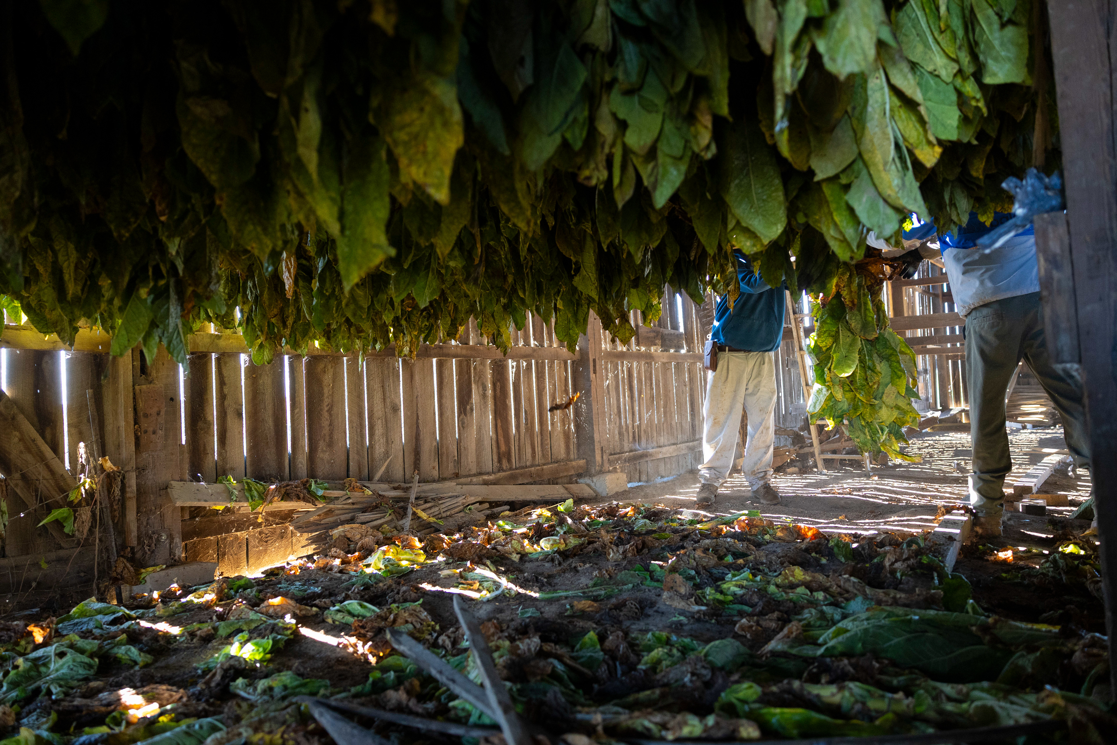 Jesus Rosas Silvero, right, passes a bushel of tobacco to Eduardo Hernandez to be hung for drying on Thursday, October 23, 2025 in Mayslick, Kentucky. The tobacco needs to dry for approximately sixty days before it is processed for distribution.